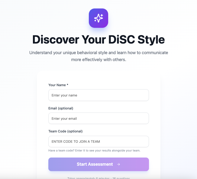 Build an app that lets a user complete a DiSC assessment. Have the app plot the result on a DiSC circle and provide insights for the user. Also, enable others to share their results on the same DiSC circle.