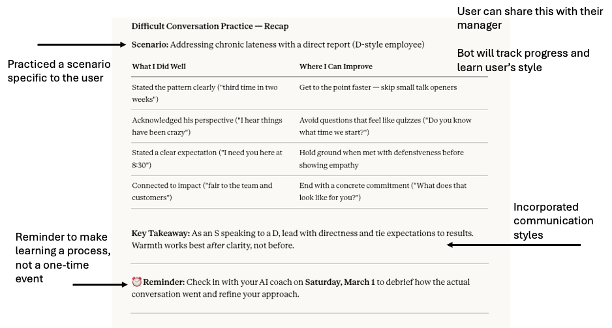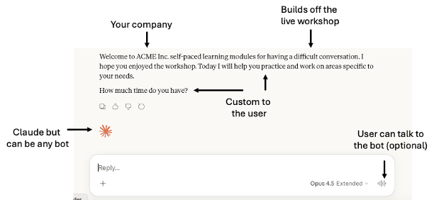 of a self-paced AI module designed to follow a two-hour live workshop on delivering feedback and managing conflict.